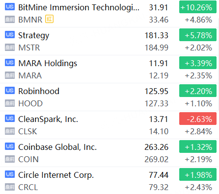 加密貨幣概念股盤前上漲,BitMine漲近5%,CleanSpark、Strategy、MARA Holdings、Coinbase、Circle漲超2%,Robinhood漲超1%;