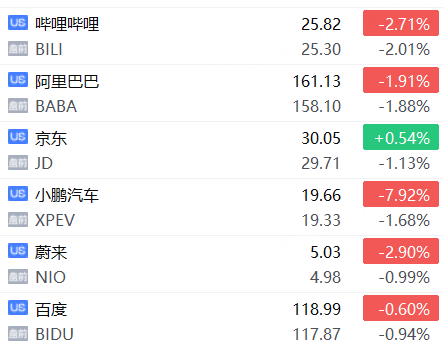 部分中概股盤前下跌,嗶哩嗶哩跌超2%,阿里巴巴、京東、小鵬汽車、百度、蔚來跟跌。