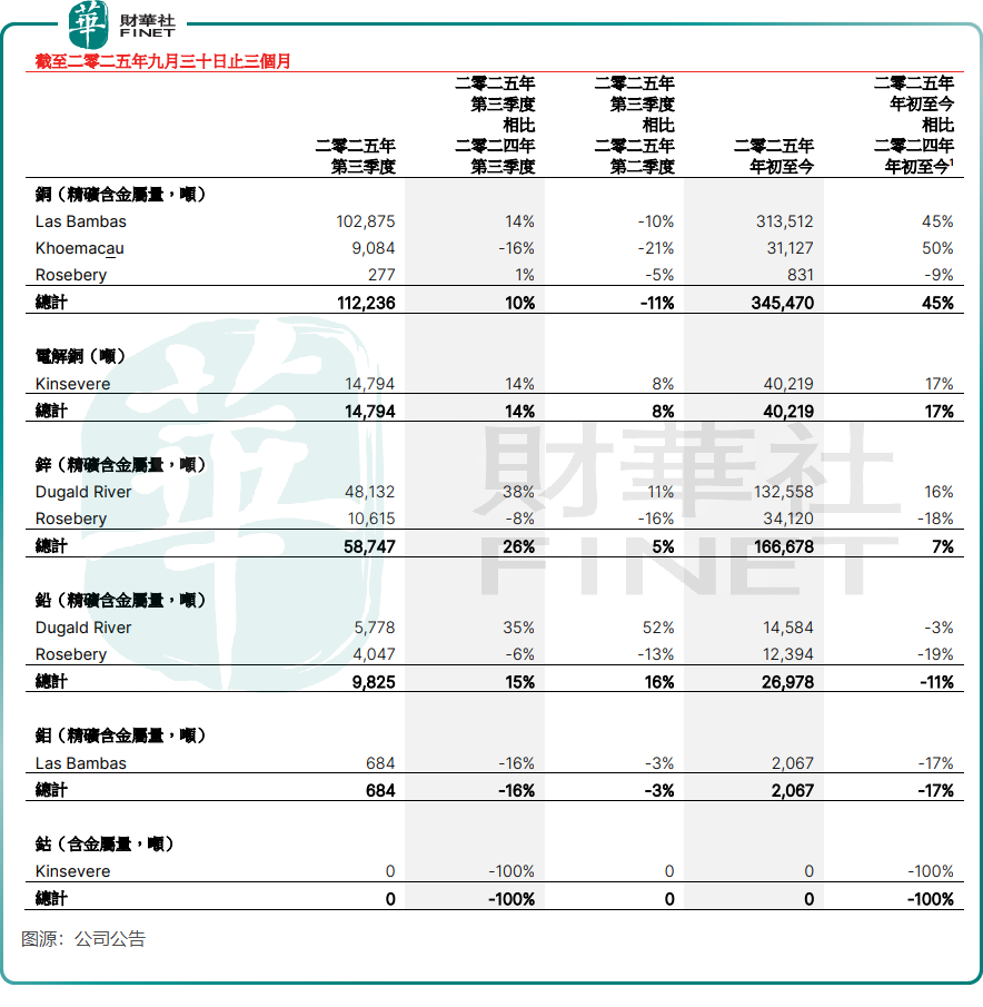 五礦資源生產端數據表現亮眼。據公司三季度生產報告顯示,旗下礦山整體處於產能爬坡期,精準契合市場需求及貴金屬價格上漲趨勢。2025年第三季度,公司銅總產量(含銅精礦含銅及電解銅)達12.7萬噸,同比增長11%;鋅總產量5.87萬噸,同比增幅高達26%。