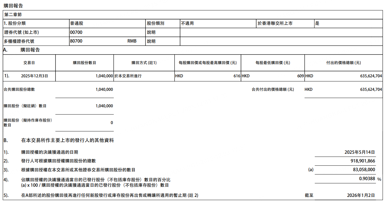12月3日,騰訊控股:12月3日斥資約6.36億港元回購104萬股股份,每股回購價格爲609港元-616港元。
