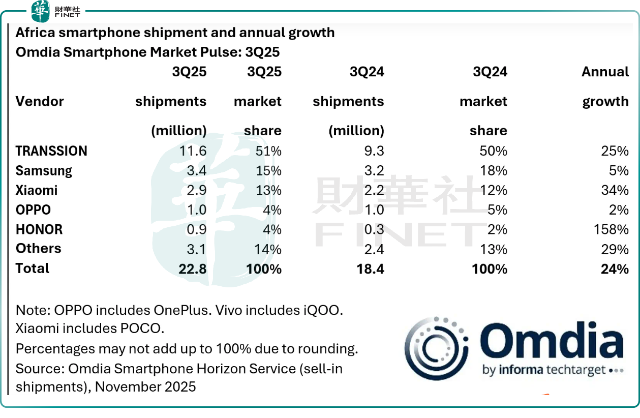 以其引以為榮的非洲市場為例,調研機構Omdia的數據顯示,2025年第3季,非洲智能手機交付量為22.8百萬部,按年大幅增長34%,也是在連續五個季度放緩後首次恢復雙位數增長,主要受到關鍵市場需求上升、匯兌穩定、融資增加以及零售活動改善所帶動。傳音期内於非洲市場的智能手機交付量為11.6百萬部,依然保持51%的強勢份額,按年增幅為25%左右。
