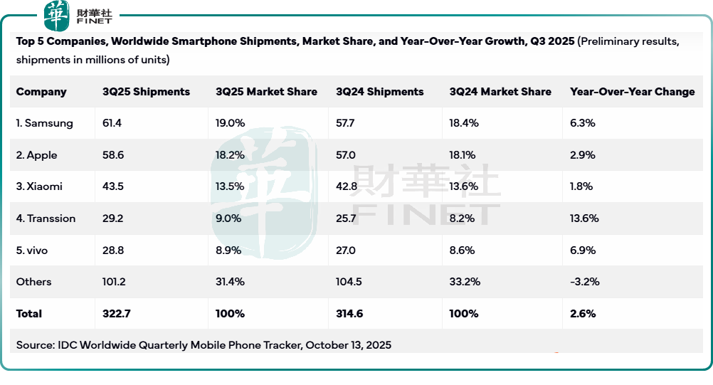 但我們留意到,第2季之後推出新品後,傳音的2025年第3季智能手機交付量數據似有改善,行業調研公司IDC的數據顯示,傳音第3季的智能手機交付量按年增長13.6%,至29.2百萬部,市場份額按年提升0.8個百分點,至9.0%,從第2季的排名第五重返第四,見下表,在五大廠商中,傳音的2025年第3季智能手機交付量增幅最高。