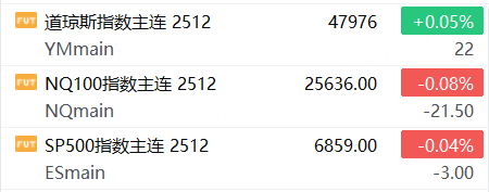 12月4日,美股三大股指期貨漲跌不一,截止發稿,道指期貨漲0.05%,納指期貨跌0.08%,標普500指數期貨跌0.04%。