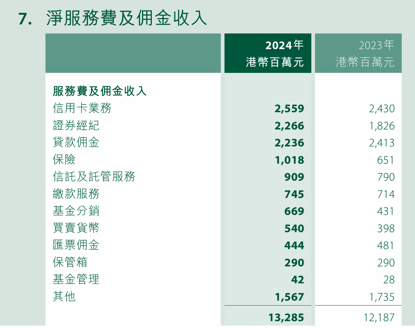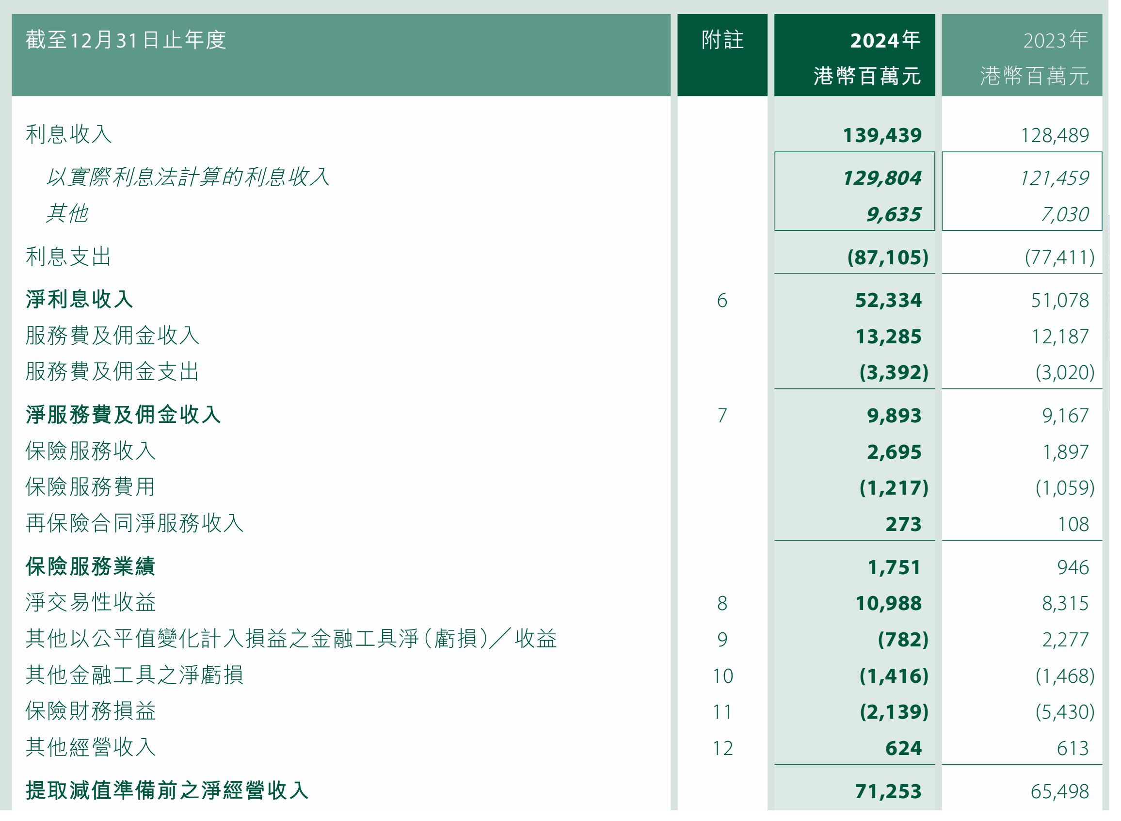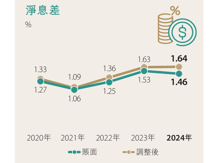 收入結構中,非利息收入佔總經營收入不少,當中包含了淨保費收入、淨交易性收益,以及淨服務費及佣金收入。