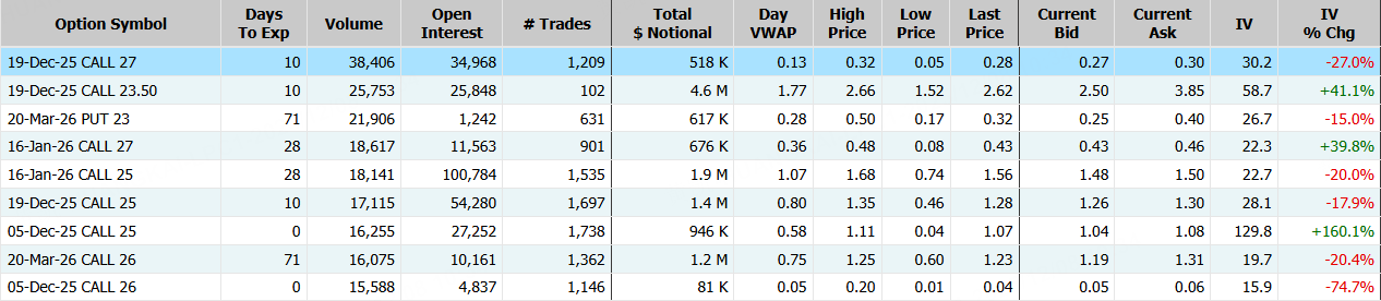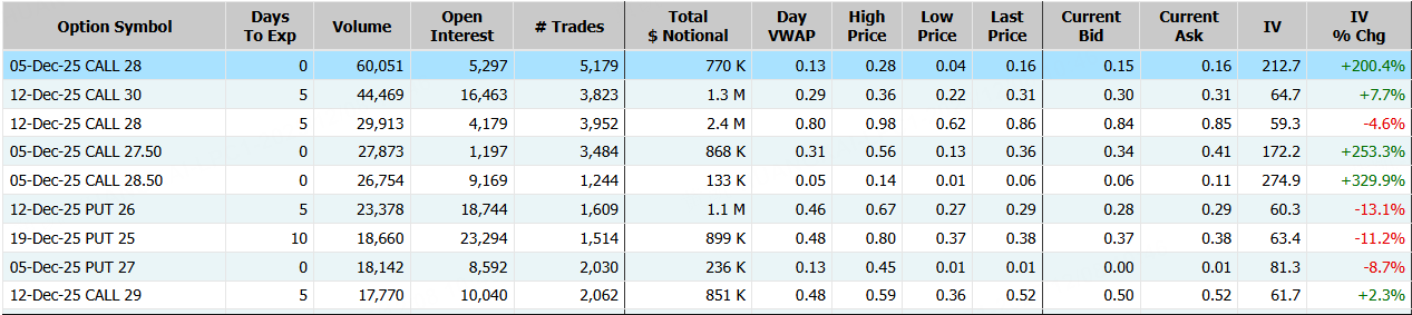 上週五,金融科技公司SoFi跌超6%,期權合約成交105.25萬張,較90日均量放大2.2倍。12月5日到期的28美元的行權看漲期權交易量特別高,共有60,051份合約交易。