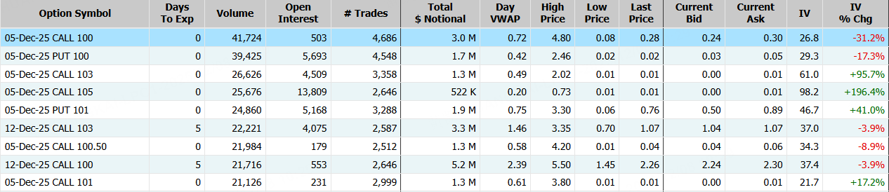 上週五,Strategy(MSTR)$跌超3%,期權合約成交99.70萬張,較90日均量放大1.8倍。12月5日到期的185美元的行權看漲期權交易量特別高,共有64,154份合約交易。