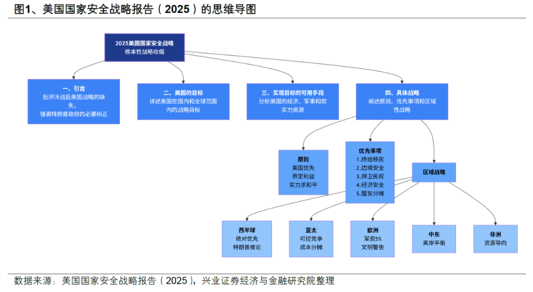 美國《國家安全戰略》報告的基本情況。當地時間2025年12月4日,美國白宮發佈了特朗普政府第二任期內的《國家安全戰略》(後文簡稱報告)。此份報告包括四個部分,分別是引言、美國的目標、美國爲實現目標可用的手段、具體戰略,在具體戰略部分又可以進一步分成原則、優先事項、區域戰略三個部分。對比拜登時期,新的《國家安全戰略》具有以下五點鮮明的特徵:一是此篇報告總篇幅明顯縮短,言簡意賅,僅有33頁,而拜登政府時期爲48頁;二是行文和語句帶有濃烈的特朗普風格——簡潔明瞭易懂;三是全文較大篇幅都聚焦美國國內問題,比如移民、邊境安全等,並着重經濟再工業化;四是歐洲方面要求其更多承擔自己的責任;五是亞太方面則強調了地緣熱點問題對美國經濟競爭的重要性,表述並不利於和平的方向。總的來看,美國戰略重心似出現收縮,但實則以退爲進,這種變化可以說是美國選擇了更爲務實的做法,但也是在全球大變局下不得不做出的一種選擇。
