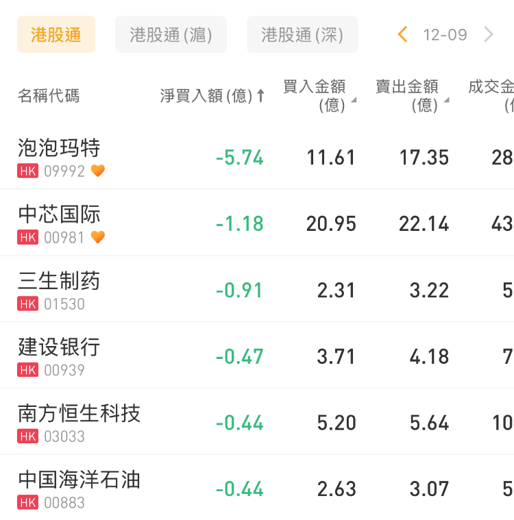 泡泡瑪特、中芯國際、三生製藥分別遭淨賣出5.74億港元、1.18億港元、0.91億港元。