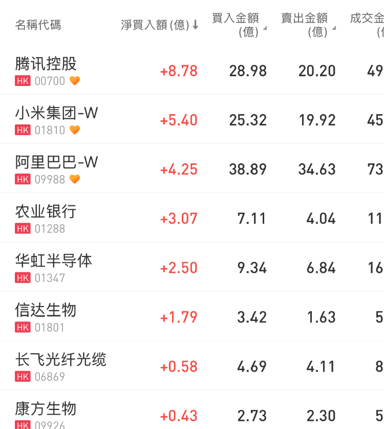 騰訊控股、小米集團-W、阿里巴巴-W分別獲淨買入8.78億港元、5.4億港元、4.25億港元;