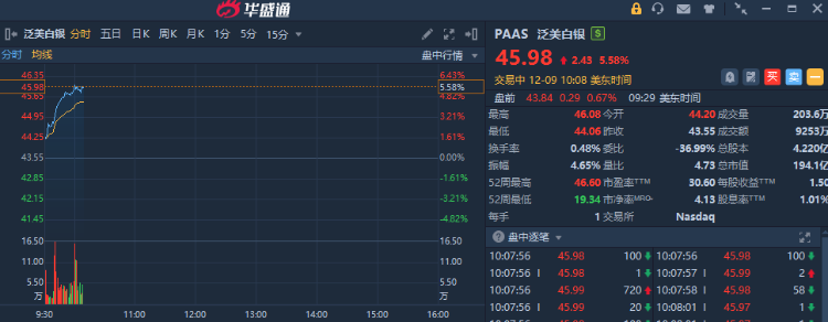 黃金白銀股集體走強,泛美白銀漲超5%,赫克拉礦業大漲超4%,哈莫尼黃金、紐曼礦業漲超2%,金田漲超1%。