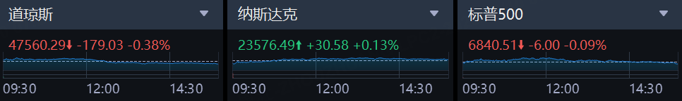 美東時間週二,美股三大指數收盤漲跌不一,投資者預計即便美聯儲本週降息,其措辭仍可能偏鷹;同時,美國最大銀行摩根大通警告2026年支出將大幅增加,拖累銀行股表現,限制大盤漲幅。截至收盤,道指跌179.03點,跌幅爲0.38%,報47560.29點;納指漲30.58點,漲幅爲0.13%,報23576.49點;標普500指數跌6.00點,跌幅爲0.09%,報6840.51點。