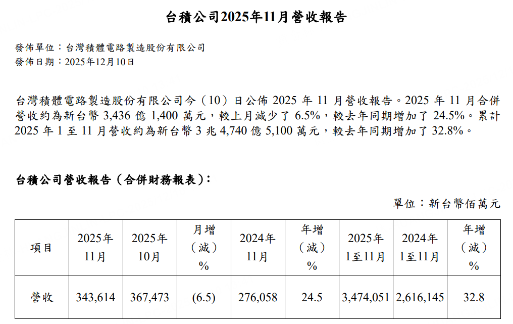 臺積電發佈11月營收數據,新臺幣3,436億元,環比上月減少了6.5%,比去年同期增加了24.5%。