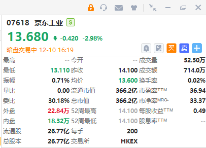華盛資訊12月10日訊,中國最大MRO採購服務商京東工業正在暗盤交易中,截至發稿跌近3%,最新總市值超366億港元。該股預計將於12月11日正式掛牌上市,配售結果將於今日晚間披露。