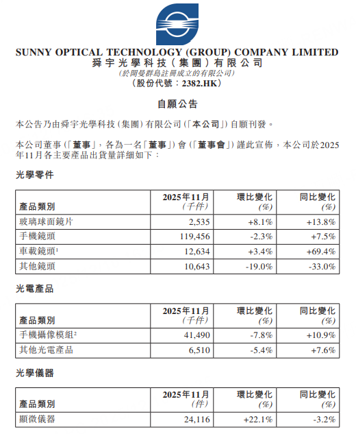 舜宇光學:11月車載鏡頭出貨量1263萬件,同比增長69%