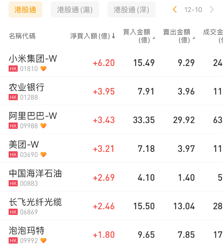 小米集團-W、農業銀行、阿里巴巴-W分別獲淨買入6.2億港元、3.95億港元、3.43億港元;