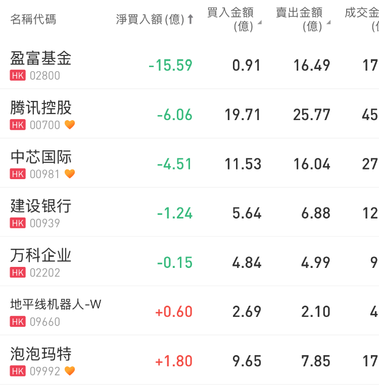 盈富基金、騰訊控股、中芯國際分別遭淨賣出15.59億港元、6.06億港元、4.51億港元。