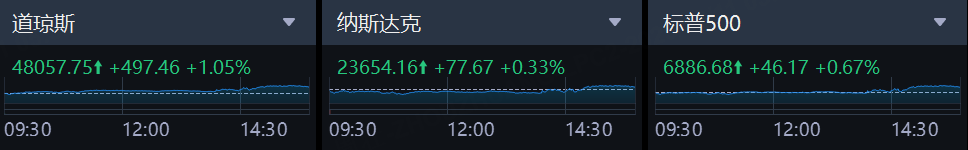 截至收盤,道指漲497.46點,漲幅爲1.05%,報48057.75點;納指漲77.67點,漲幅爲0.33%,報23654.16點;標普500指數漲46.22點,漲幅爲0.68%,報6886.73點。