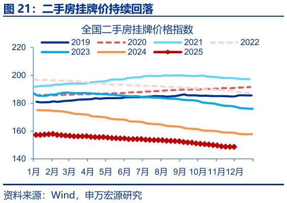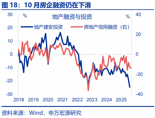 地產對經濟的拖累尚未出現改善下,11月地產投資、商品房銷售可能進一步回落。10月房企信用融資增速回落1pct至-13.9%,爲近兩年最低值;在此背景下,新開工(-15.9pct至-30.2%)、竣工(-30.3pct至-28.8%)增速明顯下滑。2021年房企融資承壓導致施工週期拉長,今年Q4地產投資的在建項目,對應的仍是2022Q4開工後的項目;而新開工自2022年Q4至今持續處於負增長區間,年內地產投資或仍較弱。銷售端,11月全國30大中城市商品房成交面積同比-33.1%、較10月回落3.4pct;結構上一線、二線成交回落幅度更大。同時房價也在回落,二手房價格指數環比-0.9%。