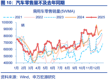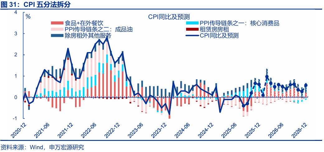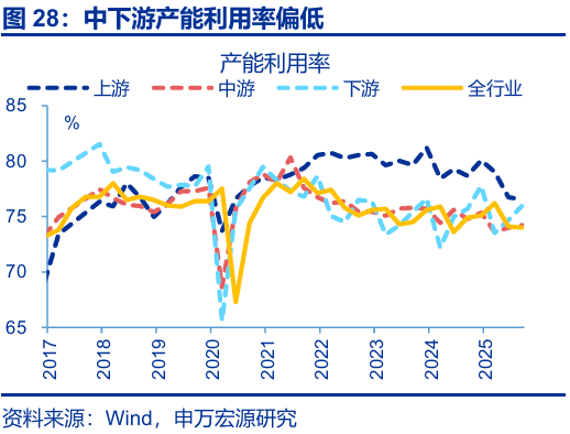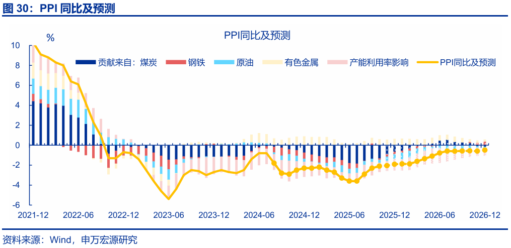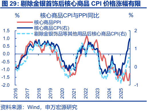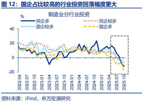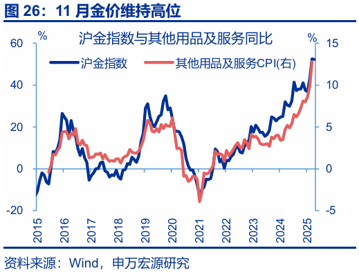 相比之下,反內卷效果落地滯後下,中下游價格修復斜率偏慢。本輪中下游產能利用率低於上游,導致上游漲價對中下游價格的拉動有限;並且中下游民企佔比較高、反內卷政策推進速度或也偏慢,約束下游漲價幅度,因而11月PPI小幅回落至-2.2%。同時,核心商品PPI偏弱或也持續傳導至核心商品CPI,同時國補退坡下需求較弱,受金價影響較小的部分核心商品CPI出現小幅回落。