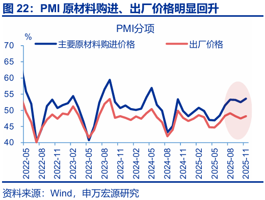 11月以來,煤、銅等上游大宗延續漲價,對PPI支撐延續。大宗價格方面,投資需求偏弱下,鋼價持續回落(環比-0.7%);同時國際油價領先我國PPI半個月,10月中旬-11月中旬油價環比-0.7%。但國內銅價、煤價延續上漲(環比分別0.2%、8.8%),預計大宗價格對PPI貢獻仍在持續。11月PMI價格也有改善,原材料購進價格(+0.1pct至53.2%)、出廠價格指數(+0.9pct至48.2%)均有回升。