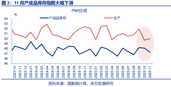 11月,在“高庫存”的約束下,生產或呈現“弱改善”特徵;邊際上看,庫存已在加快去化,或令後續生產有序恢復。製造業PMI在10月大幅回落後,11月僅較前月回升0.2pct至49.2%。其中,生產指數僅上行0.3pct至50%,或源於前期庫存累高仍在約束當前生產; 11月採購量指數(+0.5pct至49.5%)的回升幅度也明顯弱於前月的回落幅度(-2.6pct至49%)。冶金鍊、石化鏈、消費鏈高頻指標亦可驗證,預計11月工業增加值增速或持平於4.9%。但邊際上,11月產成品去庫加快,使高庫存對後續生產的影響或有減弱;數據上11月產成品庫存指數爲47.3%,較上月回落0.8pct。
