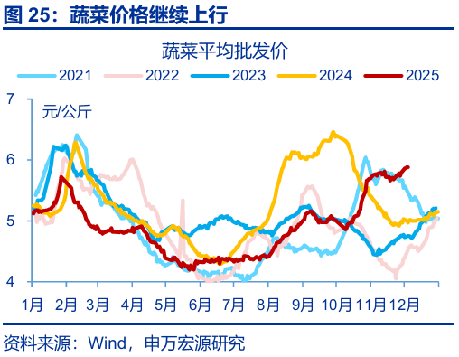 基數走低下,鮮菜、黃金等大宗漲價提振CPI,CPI同比明顯回升。從高頻看,雖然前期生豬存欄持續增加對豬價的約束仍在顯現,11月以來豬肉價格環比-1.4%;但鮮菜(10%)價格環比強於去年同期,鮮果(1.3%)與往年相近,整體來看食品CPI同比或有修復。核心CPI方面,國補商品或轉爲商補拖累CPI讀數,但金價同比(52.1%)持平前月高位,加之人流出行數據仍相對較好,或支撐核心服務CPI,疊加翹尾因素明顯走低,11月CPI同比回升至0.7%。