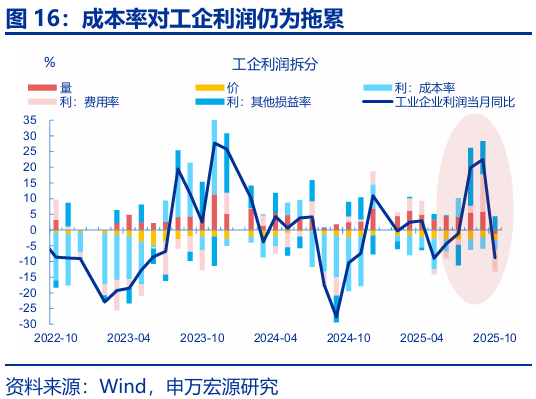 "反內卷"政策思路從嚴格限產轉向構建中性成本機制,因而製造業中下游的反內捲進度偏慢,也令成本率仍處歷史高位。2025年中,政策對“反內卷”的重視度明顯提升。與供給側改革期間嚴格限產的政策思路不同的是,本輪“反內卷”政策更加強調構建行業中性成本機制,引導企業避免低價傾銷式競爭,,而非直接約束中下游生產,因而也導致“反內卷”進度偏慢的領域聚焦在中下游。規模以上企業數據顯示,目前成本率仍維持高位、特別是下游消費鏈成本率明顯偏高,10月成本對利潤同比的拉動仍維持在負區間(-3.2%)。同時,費用率、其他損益項(投資收益、營業稅金及附加等雜項支出)等短期指標對利潤同比拉動也有明顯回落。