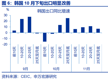 11月需求修復可能相對更好,表現爲短期供給擾動消退,對出口形成較大支撐。從前兩個月情況看,全球需求保持穩定的背景下,出口在9月衝高後、10月回落至-1.1%,反映供給因素對出口的影響更爲重要。具體表現爲一是10月工作日天數同比減少,對供給有較大拖累;二是9月受中秋國慶長假的影響,製造業“搶生產”現象明顯,帶動部分商品在9月集中出口,而10月“搶生產”效應退坡拖累出口。11月,工作日天數同比增加2天,“搶生產”透支效應明顯回落,因而帶動出口本月回升較大。