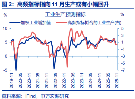 在高庫存的約束下,11月生產或呈現弱改善特徵;邊際上看,庫存已在加快去化,或令後續生產有序恢復。製造業PMI在10月大幅回落後,11月僅較前月回升0.2pct至49.2%。其中,生產指數僅上行0.3pct至50%,或源於前期庫存累高仍約束當前生產,預計11月工業增加值增速或持平在4.9%。但邊際上,11月產成品去庫已在加快,使高庫存對後續生產的影響或有減弱。