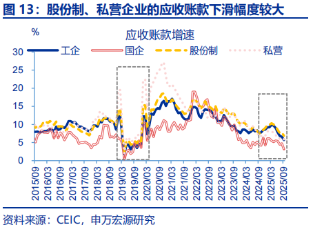 11月經濟增長壓力或仍聚焦於製造業領域,主要表現爲企業加快清繳欠款,對投資產生額外拖累。本輪化債也要求企業加快清繳欠款,但由於當前企業盈利偏弱,企業或將投資的資金用於清繳欠款,導致固定投資回落;10月應收賬款增速降至5.1%。此外,去年來製造業投資強勁並非源於政策驅動,更多是設備處於自然更新上行週期;但下半年來,自然週期退坡,或也拖累製造業投資。