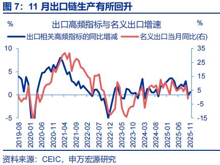相比之下,需求修復可能較好,表現爲短期供給擾動消退,對出口形成較大支撐。近期全球需求波動較小,但出口在9月衝高後、10月回落至-1.1%,11月又上行至5.9%,或顯示外需並非影響近期出口波動的主因。從前兩個月看,工作日天數波動、節假日前“搶生產”等因素對出口影響或更重要。11月工作日天數同比增加2天,“搶生產”透支效應回落,因而本月出口回升至5.9%。