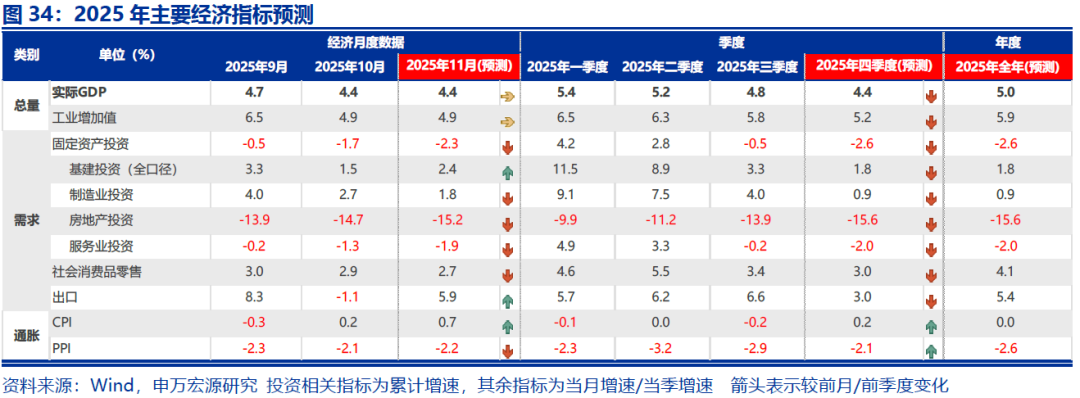 總結:11月經濟“量”“價”均出現改善跡象,數據擬合後的實際GDP或爲4.4%、保持增長韌性。11月以來,受前期庫存走高影響,供給回升幅度或相對有限;但需求側改善幅度可能更爲明顯,主要表現在三個方面,一是短期因素對出口的衝擊或明顯改善,二是化債對投資的擠出效應或有緩解,三是秋假或支撐服務消費維持高位。價格方面主要是上游大宗價格對通脹形成支撐,但中下游價格受內卷影響可能仍相對偏弱。整體來看,11月經濟增長在合理區間,短期內經濟修復或接近拐點。生產法下,通過數據擬合來看,11月GDP實際同比或在4.4%左右。