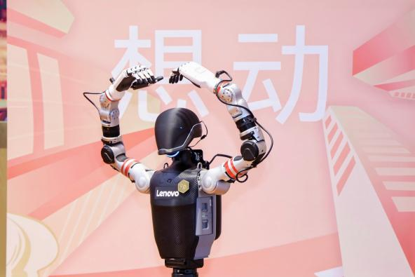 最先亮相的是聯想首位硅基員工“樂享壹號”。它不但參與了捐贈儀式,還帶着孩子們一起打起了太極,孩子們瞬間圍攏過來,迫不及待地和它問答、互動。