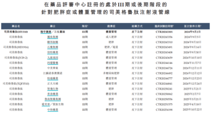 蔓迪國際在體重管理領域的業務儲備或許更受外界關注。招股書顯示,公司用於體重管理的長效型GLP-1受體激動劑—司美格魯肽注射液,正在中國進行III期臨牀試驗,目標於2026年上半年提交藥品註冊申請。公司稱,該產品有望成爲中國首批獲批用於體重管理的國產司美格魯肽製劑。