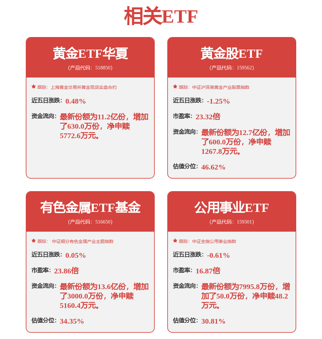 12月11日,受降息落地及鮑威爾鴿派言論催化,金銅價攜手走強,銀價再創新高,黃金有色相關ETF集體走強,截至9:46,黃金ETF華夏(518850)漲0.75%,有色金屬ETF基金(516650)漲1.68%,黃金股ETF(159562)漲2.13%,其持倉股山金國際漲5.88%,株冶集團、赤峯黃金、紫金礦業等股紛紛走強。
