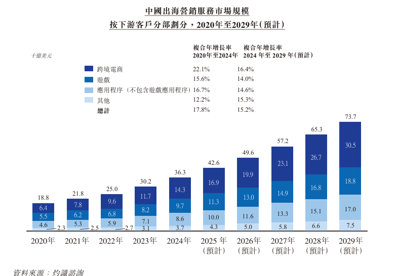 於2024年,中國出海營銷服務行業市場規模達363億美元。隨着出海企業及其營銷需要的持續增長,預計市場到2029年擴大至737億美元,2024年至2029年間複合年增長率爲15.2%。