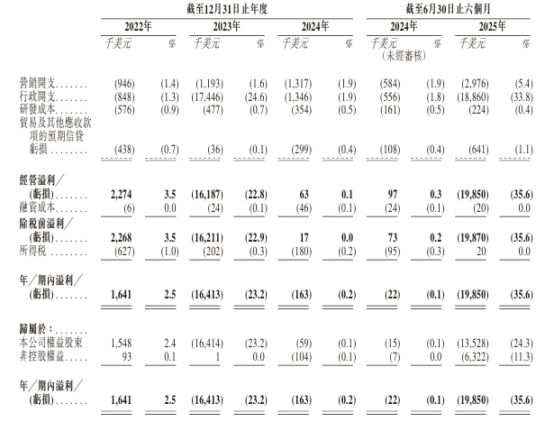 業務轉型方面,公司稱已成功將業務模式從傳統的跨境貿易中介機構轉型爲數字廣告代理,並進一步成爲跨境電商服務提供商。但實際轉型成效一般,亦未能突破對單一業務的依賴。2025年上半年,超過98%的營收仍然來自海外營銷服務,數字展覽服務、海外電商運營佔比不足1%。同時,招股書提及的AI驅動工具、大數據分析等技術能力,實則是對巨頭流量工具的二次包裝,2025年上半年,行政開支高達1886萬美元,相較研發成本僅22.4萬美元。