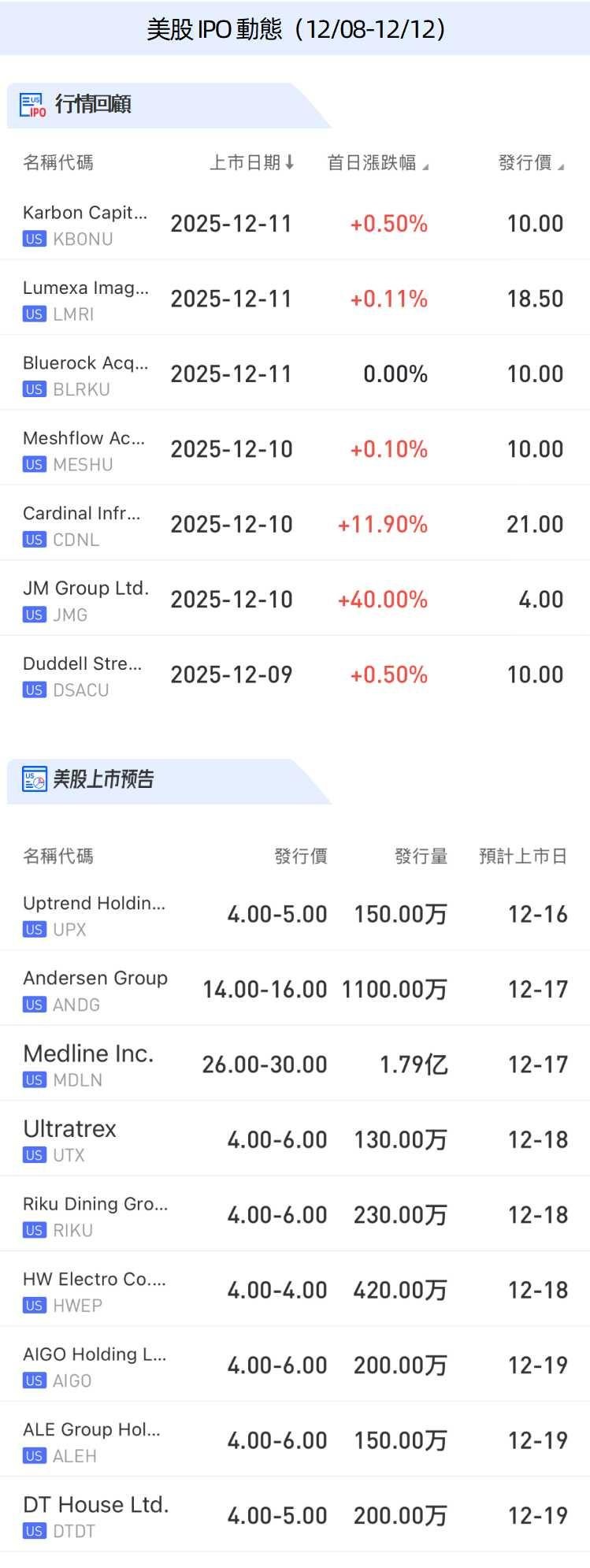 兩隻新股漲勢較強,其中JM Group Ltd $JMG 上市首日漲40%、基礎設施服務公司Cardinal $CDNL 上市首日漲11.8%。此外, $DSACU 、 $MESHU 、 $BLRKU 、 $LMRI 、 $KBONU 上市首日漲幅均在1%內。