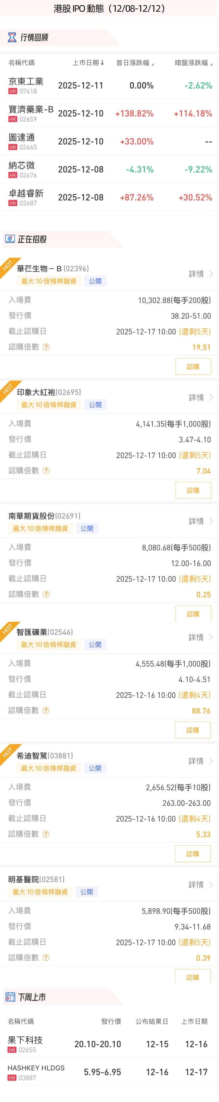目前,有6家正在招股,分別是南華期貨、明基醫院、印象大紅袍、華芢生物-B、希迪智駕、智匯礦業;預計下週有4家公司上市,包括HASHKEY $03887.HK 、果下科技等