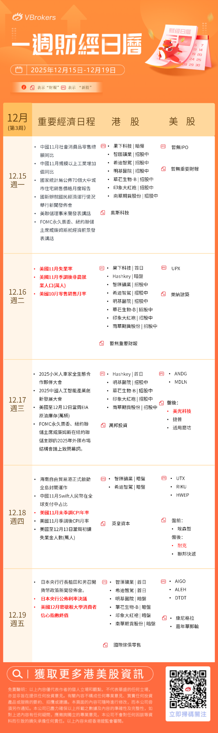港股方面,下週共計6只新股招股、4只新股上市 週一(12.15):