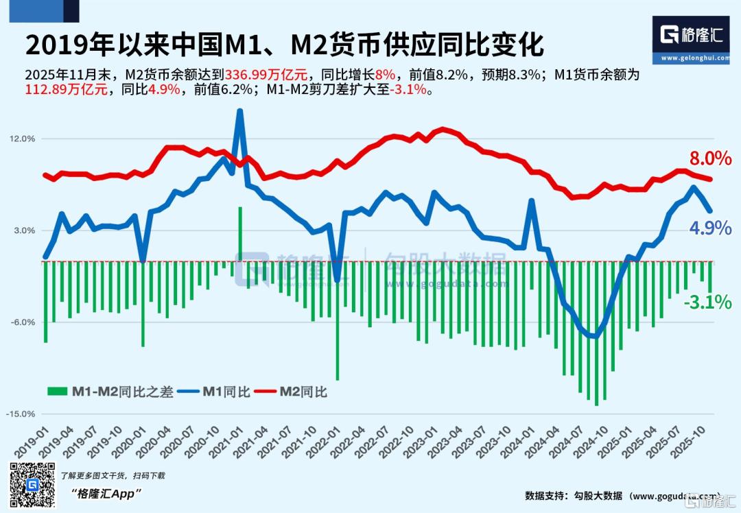 中國央行公佈2025年11月份金融數據顯示:中國11月新增社融2.49萬億元,新增人民幣貸款3900億元。11月末的M2-M1剪刀差是3.1個百分點,較上月的2.0個百分點有所擴大。1-11月社會融資規模增量累計爲33.39萬億元,比上年同期多3.,99萬億元。新增人民幣貸款15.36萬億元(低於預期的154176億元)。人民幣存款增加24.73萬億元。11月末的M2-M1剪刀差是3.1個百分點,較上月的2.0個百分點有所擴大。