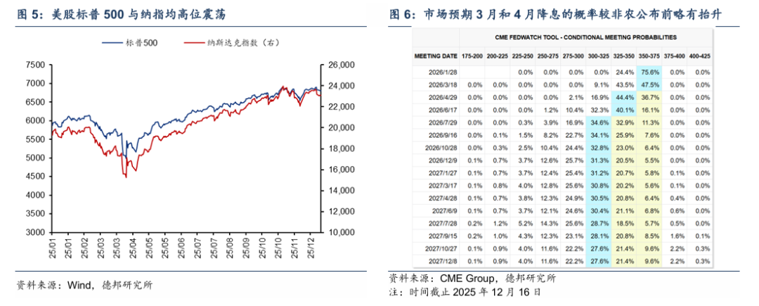 降息預期略有抬升,整體影響不明顯。由於這份就業數據可能受到政府停擺的干擾,且11月新增數量較小,目前來看對降息預期的提升作用並不明顯。CME模型顯示,非農公佈之前,預期明年3月、4月降息25bp的概率分別爲41.9%和43.8%,公佈後兩者分別略微提升至43.5%和44.4%。下一個貨幣政策節奏的觀察點是本週公佈的通脹數據,以及特朗普對於美聯儲主席的提名。
