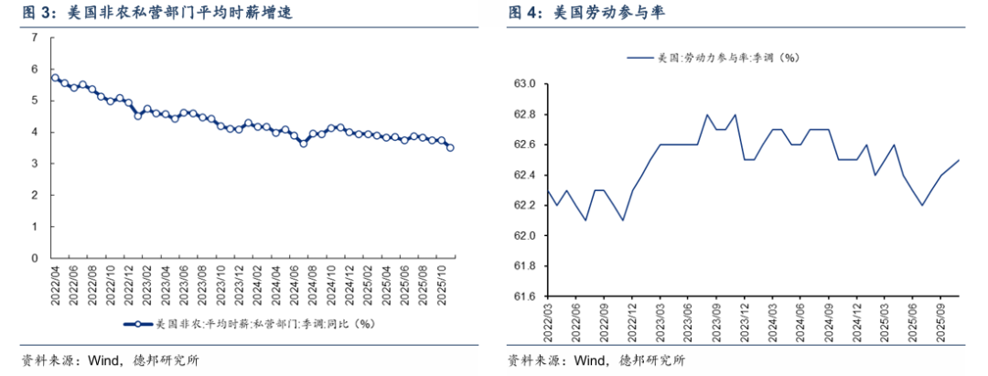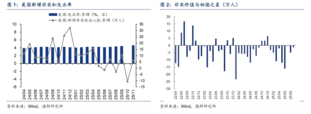 解讀:整體來看,這份就業數據偏弱,參考意義相對有限,市場解讀爲就業增長動能減弱。第一,11月非農的淨增幅並不大,即便超出預期值,對市場的預期影響也較爲有限。第二,11月的失業率意外升至4.6%。第三,薪資增速也顯示勞動力市場降溫,11月平均時薪同比增長3.5%,爲2021年5月以來最低增速。第四,10月就業人數下降幅度明顯超出預期,8月和9月非農均下修,均顯示就業市場活力不足。第五,美國勞工統計局表示,無法量化政府關門對10-11月就業人數調查的影響,因此10月和11月的就業數據的參考意義可能沒有那麼強。因此整體來看,這份就業數據顯示美國勞動力市場仍然偏弱,但考慮到數據的可靠性和邊際變化幅度較小,市場的反應可能不會非常強烈。