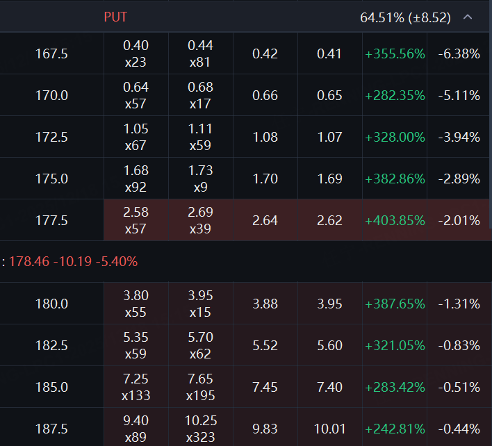 隨着股價走低,甲骨文的認沽合約成交價格暴漲,一張177.5美元行權價的PUT,價格漲幅超400%。