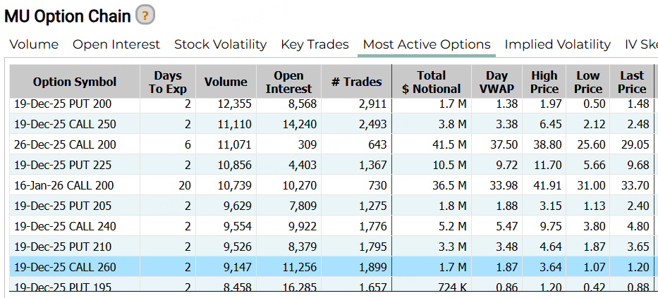 期權方面,美光排名前十的合約中,一張本週五到期的CALL,行權價達260美元,較現價有約15%的漲幅空間。