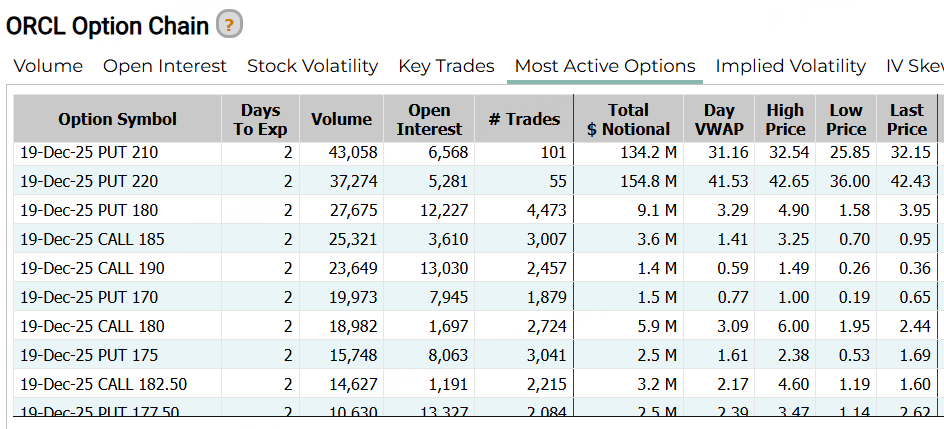 期權方面,甲骨文昨日成交量排名前三位的都是PUT。一份本週五到期的認購合約行權價爲190美元。