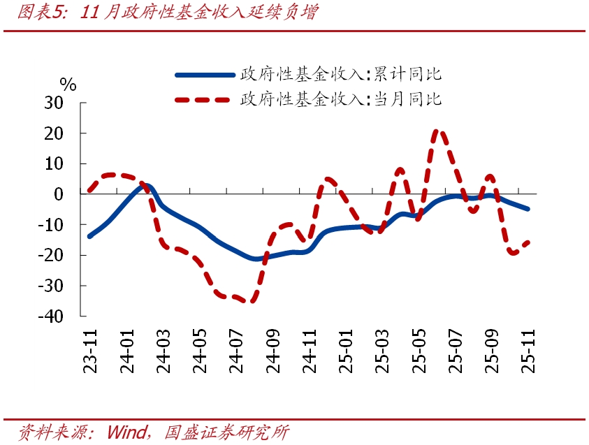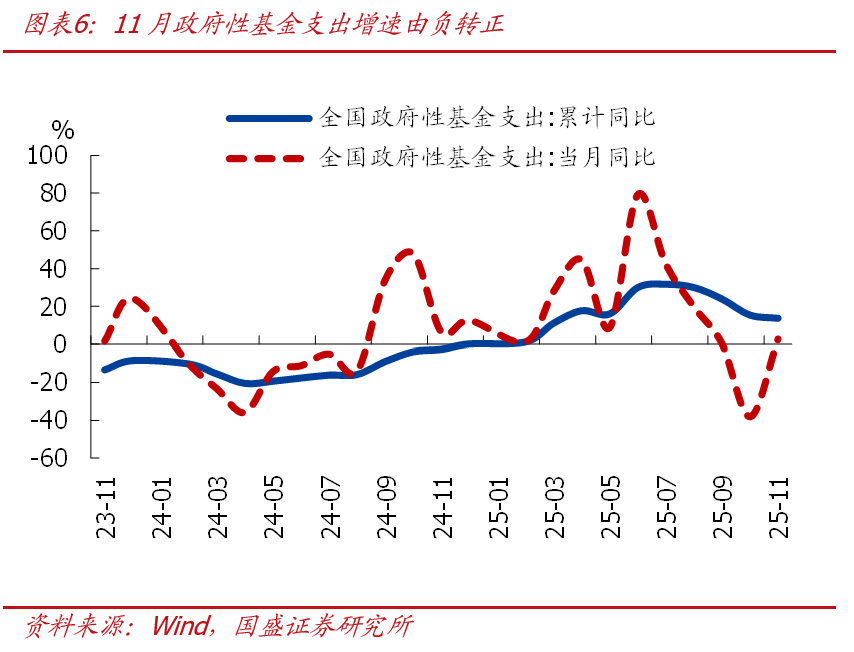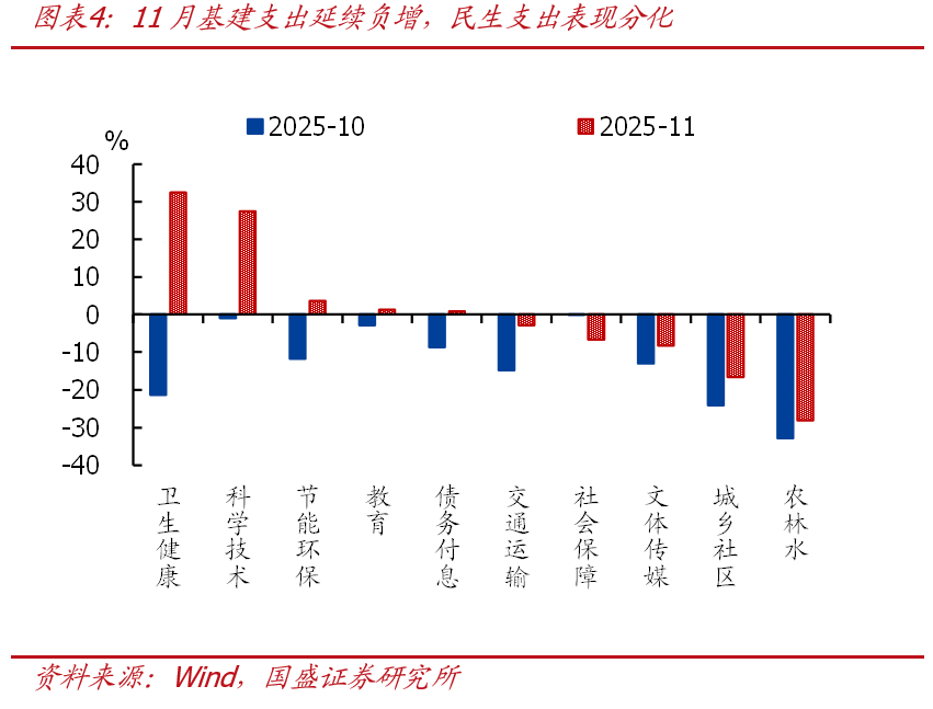 >一般財政支出連續兩個月負增、支出節奏也明顯慢於季節性,地方財政支出偏慢仍是主要拖累,基建支出延續較大降幅、民生支出表現分化。11月一般財政支出2.27萬億,同比-3.7%、連續兩個月負增。支出進度來看,11月一般財政支出佔全年比重爲7.6%,也明顯低於季節性(近三年同期均值爲8.2%)。結構上看,中央財政支出同比4.9%、較上月抬升5.9個百分點,地方財政支出同比-5.1%、連續兩個月負增。投向上看,基建相關支出同比-19.4%、延續較大降幅,城鄉社區事務、農林水、交通運輸相關支出增速均延續負增;民生方面,表現分化,教育、衛生健康相關支出增速由負轉正,社會保障相關支出降幅進一步走擴。