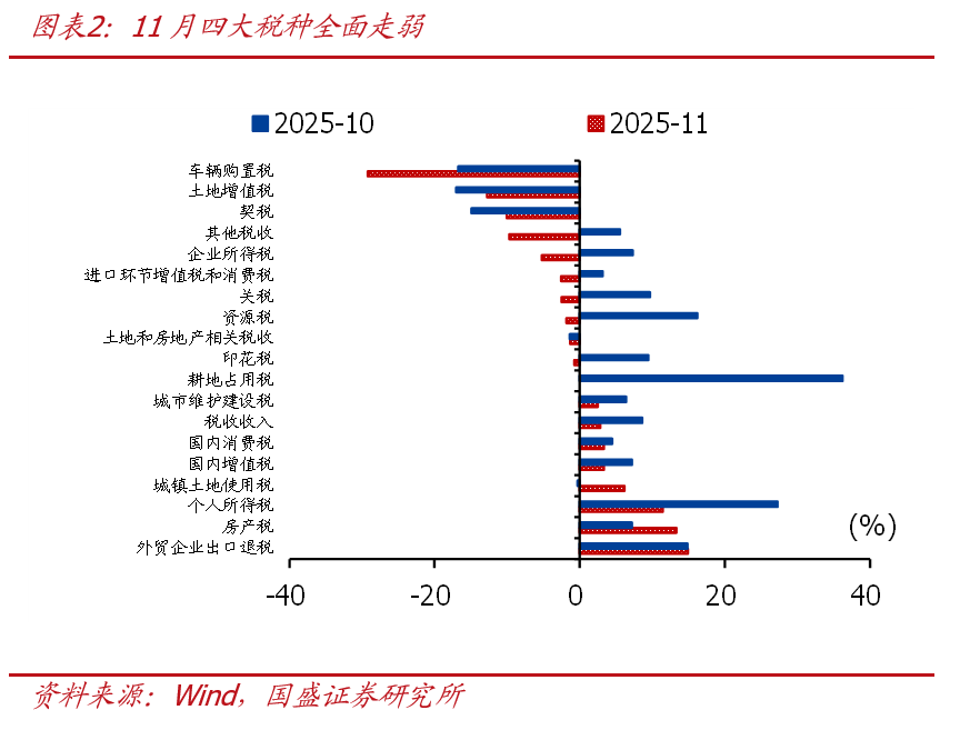 1、單月看,11月一般財政收入增速由正轉負,稅收和非稅收入雙雙走弱,四大稅種收入均不同幅度回落;一般財政支出連續兩個月負增、支出節奏也明顯慢於季節性,地方財政支出偏慢仍是主要拖累,基建支出延續較大降幅、民生支出表現分化。政府性基金收入延續較大降幅,土地出讓收入偏弱仍是主要拖累;政府性基金支出增速由負轉正,年底盤活地方政府債券額度、基數走低是主要支撐。