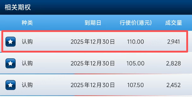 期權方面,美團上午排名前三的合約都是認購合約,其中排名第一的CALL行權價110港元,到期日爲12月30日。
