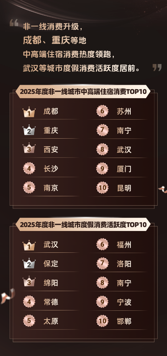 同程旅行發佈的2025年非一線城市中高端住宿消費榜單顯示,成都、重慶、西安等非一線城市的中高端住宿消費熱度位居前列,其中既有來自跨地區遊客的消費,也有來自本地及周邊居民的短途休閒度假消費。